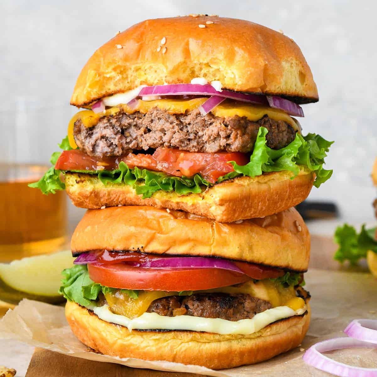 A hamburger, simply known as a burger, consists of fillings—usually a patty of ground meat, typically beef—placed inside a sliced bun or bread roll. The patties are often served with cheese, lettuce, tomato, onion, pickles, bacon, or chilis with condiments such as ketchup, mustard, mayonnaise, relish or a “special sauce”, often a variation of Thousand Island dressing, and are frequently placed on sesame seed buns. A hamburger patty topped with cheese is called a cheeseburger.[1] Under some definitions, and in some cultures, a hamburger is considered a sandwich.